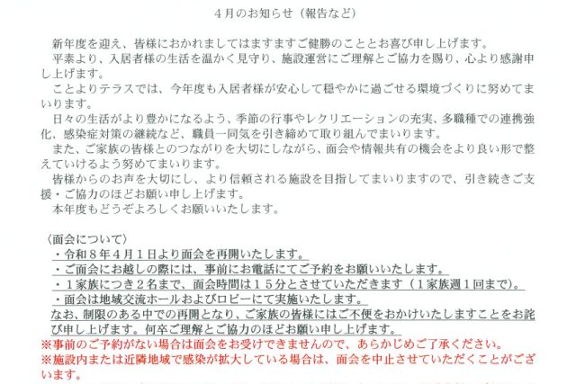日頃より当施設の運営にご理解とご協力をいただき、ありがとうございます。